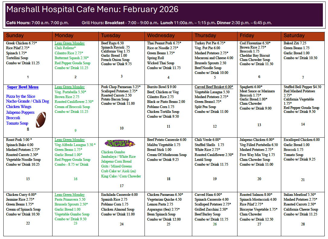 Marshall is proud of the chef-inspired, quality food we serve to patients and their visitors. Our café is open seven days a week from 7 a.m. to 7 p.m. Freshly prepared hot food is available from 7 to 9:30 a.m., from 11 a.m. to 2 p.m. for lunch and from 4:30 to 7 p.m. for dinner.