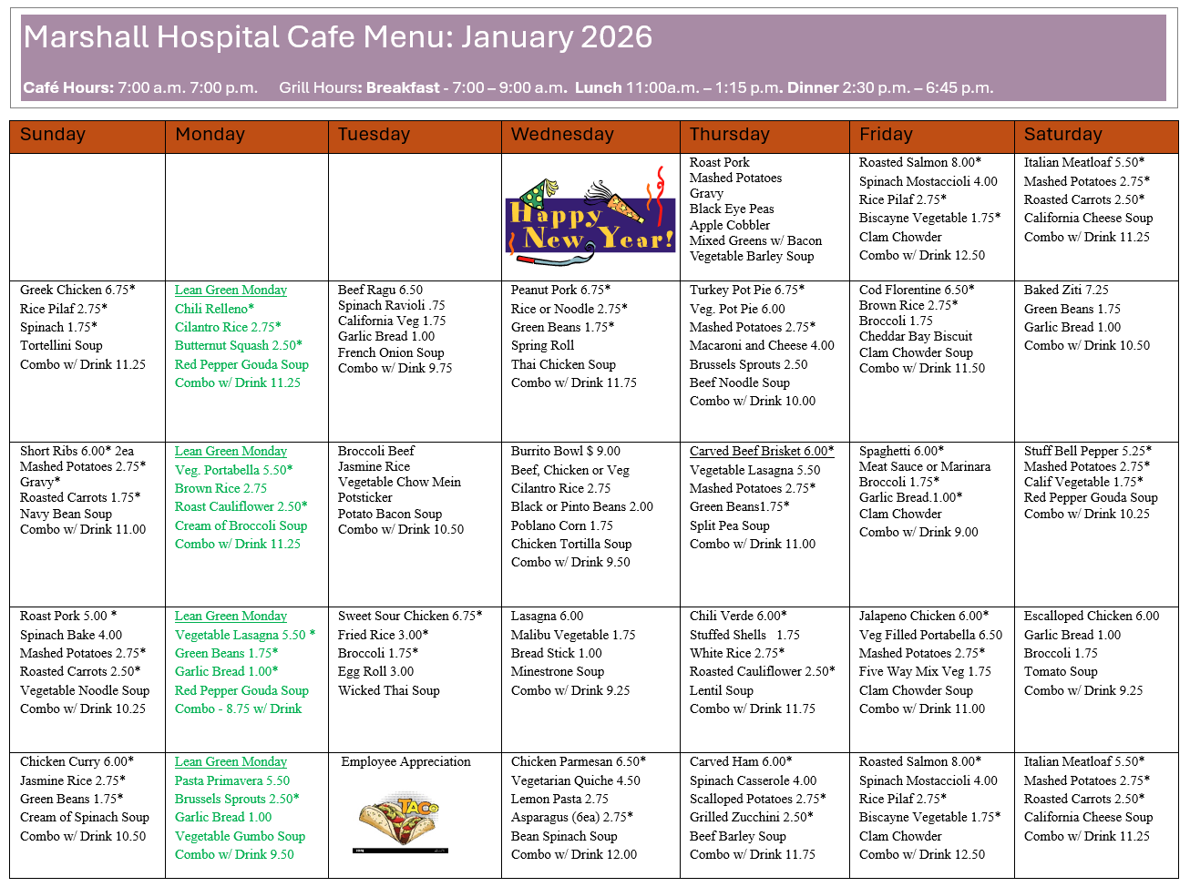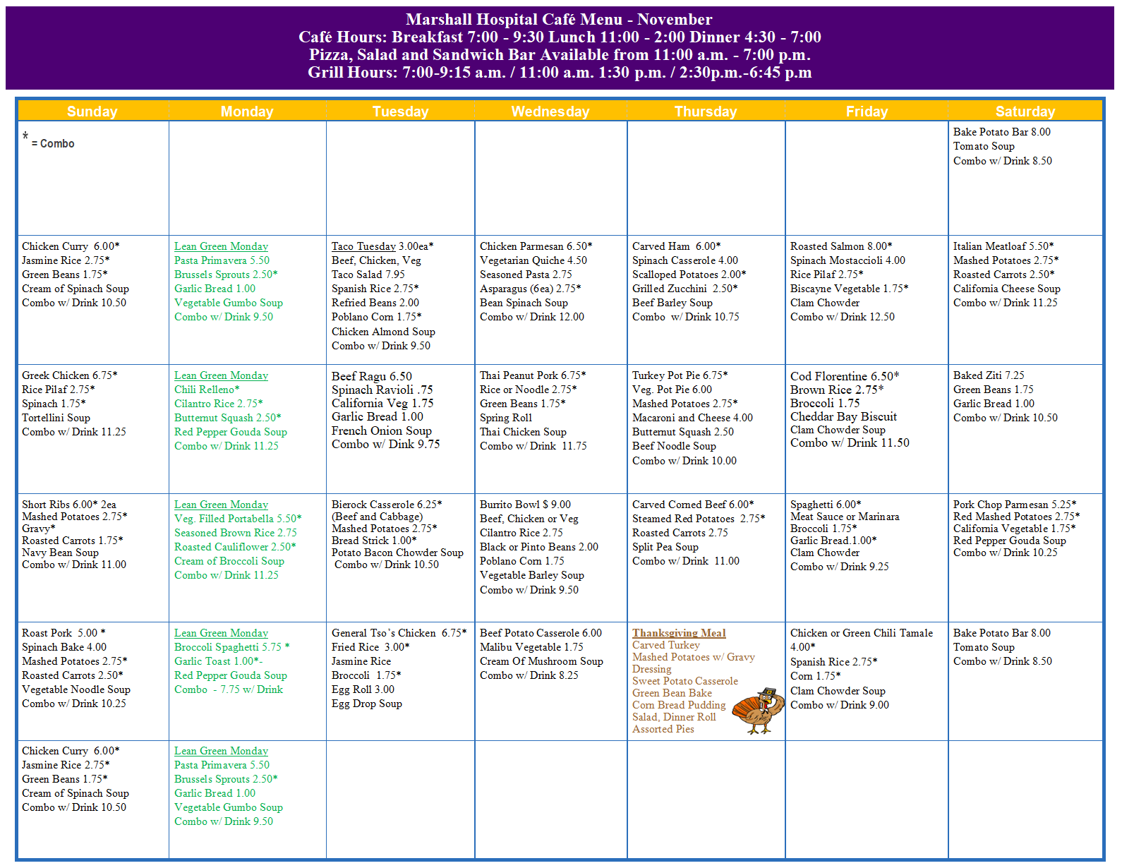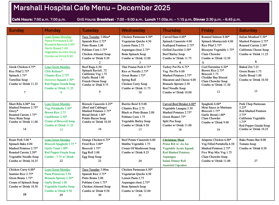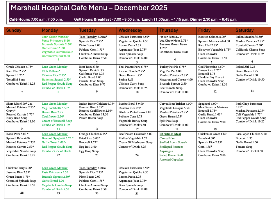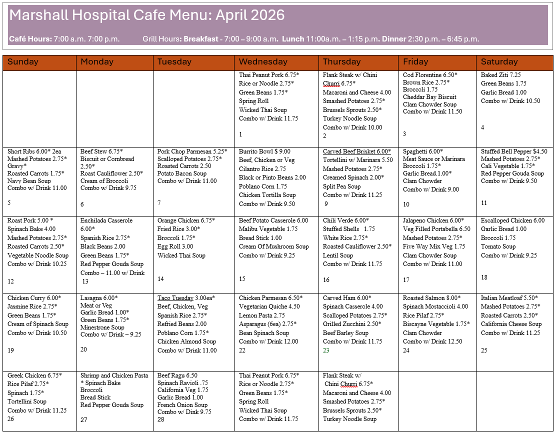 Marshall is proud of the chef-inspired, quality food we serve to patients and their visitors. Our café is open seven days a week from 7 a.m. to 7 p.m. Freshly prepared hot food is available from 7 to 9:30 a.m., from 11 a.m. to 2 p.m. for lunch and from 4:30 to 7 p.m. for dinner.